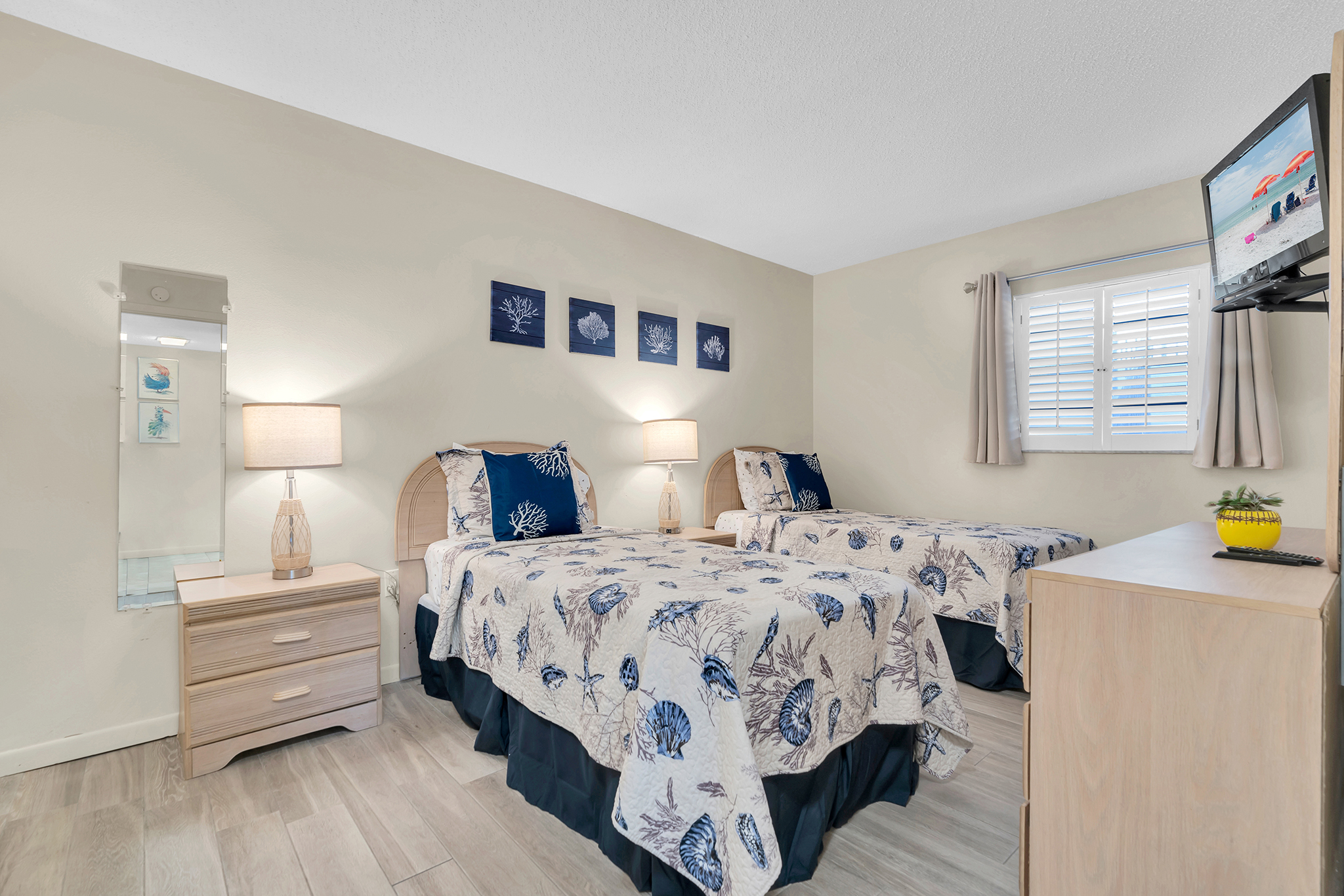 The second bedroom hosts a bedroom set that can be converted from two twin beds to a single king-size bed at your request. The bedroom includes a wall-mounted flat screen TV keeps you entertained.
