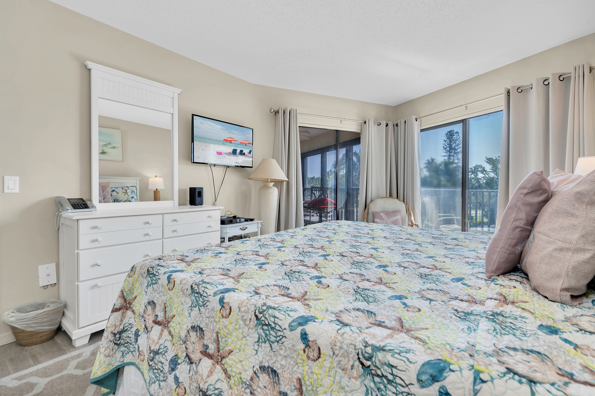 The primary suite hosts a king bedroom, a wall-mounted flat screen TV and an en suite bath with shower stall with seat.